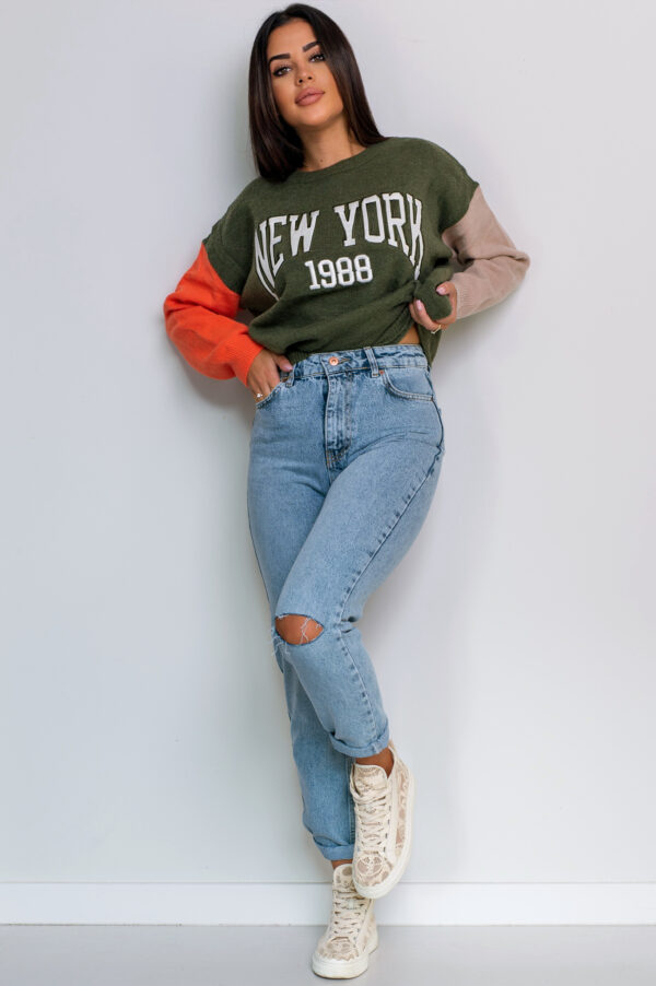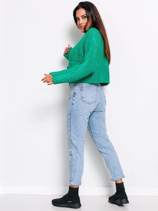Spodnie jeansowe delikatnie elastyczne z wysokim stanem. Maja opcje „push up” i pięknie podkreślają pupę. Posiadają kieszenie oraz delikatne przecięcie na jednej nodze. Nogawka jest delikatnie zwężana, jest to rodzaj spodni tzw „boyfriendow”.